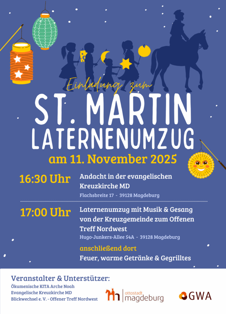 Einladung zum St. Martin Laternenumzug am 11.11.25 Am 11. November wird der St. Martin Laternenumzug in Nordwest stattfinden. Kommt gerne vorbei. Los geht es um 16:30 mit einer Andacht in der Kreuzkirche in der Flachsbreite 17 Noch Fragen?
